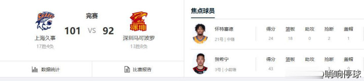 此役,怀特塞德拿到24份18篮板2抢断1盖帽,张镇麟拿到12分4篮板8助攻1抢断3盖帽,两人都是末节帮助上海赢球的最大功臣!贺希宁今晚空砍43分4篮板,确实已经尽力了,无奈球队轮转深度不够。