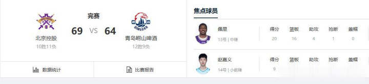 值得一提的是,本场北控两人拿到两双数据,佩里20分16篮板,邹雨宸11分11篮板,伤愈复出的沈梓捷只打了16分钟,拿到4分4篮板!青岛队只有3人得分上双,其中米奇11分12篮板,并贡献了五佳球灌篮。