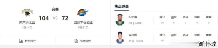 南京主场迎战四川,赛前四川已经20连败,是稳定的联盟副班长垫底存在,所以本场比赛也没什么悬念,南京队从首节开始领先,全场都在压制对手,最终南京104-72大胜四川,昔日卫冕冠军四川队遭遇21连败!